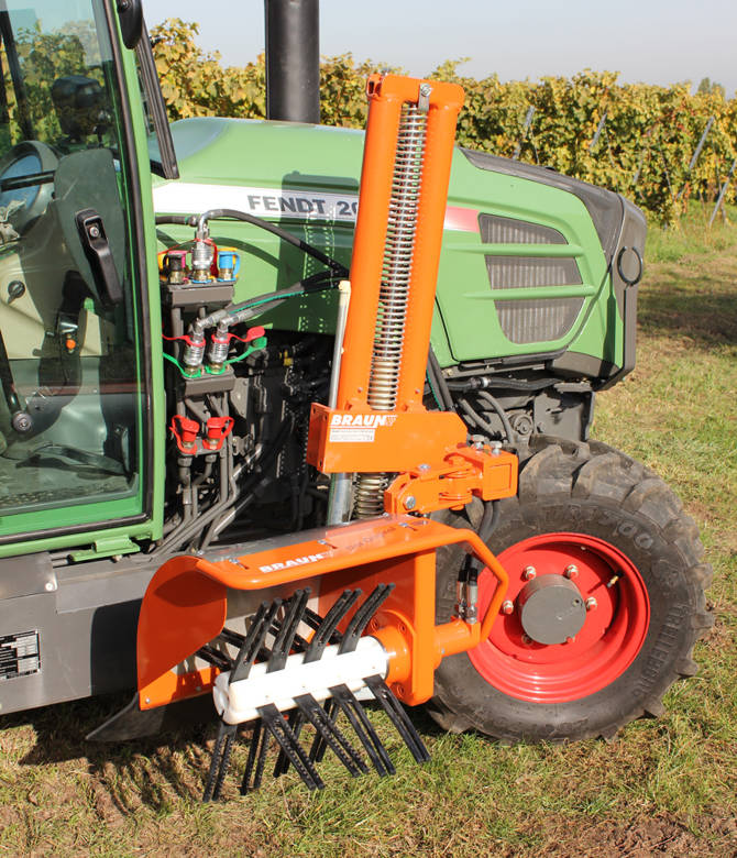 Per questa operazione abbiamo la spollonatrice Braun che grazie ai suoi gommini telati va a replicare l’operazione manuale dell’uomo. Invece per chi vuole spollonare la parte basale e unire questa lavorazione al taglio dell’erba proponiamo la diserbatrice a filo Braun.
